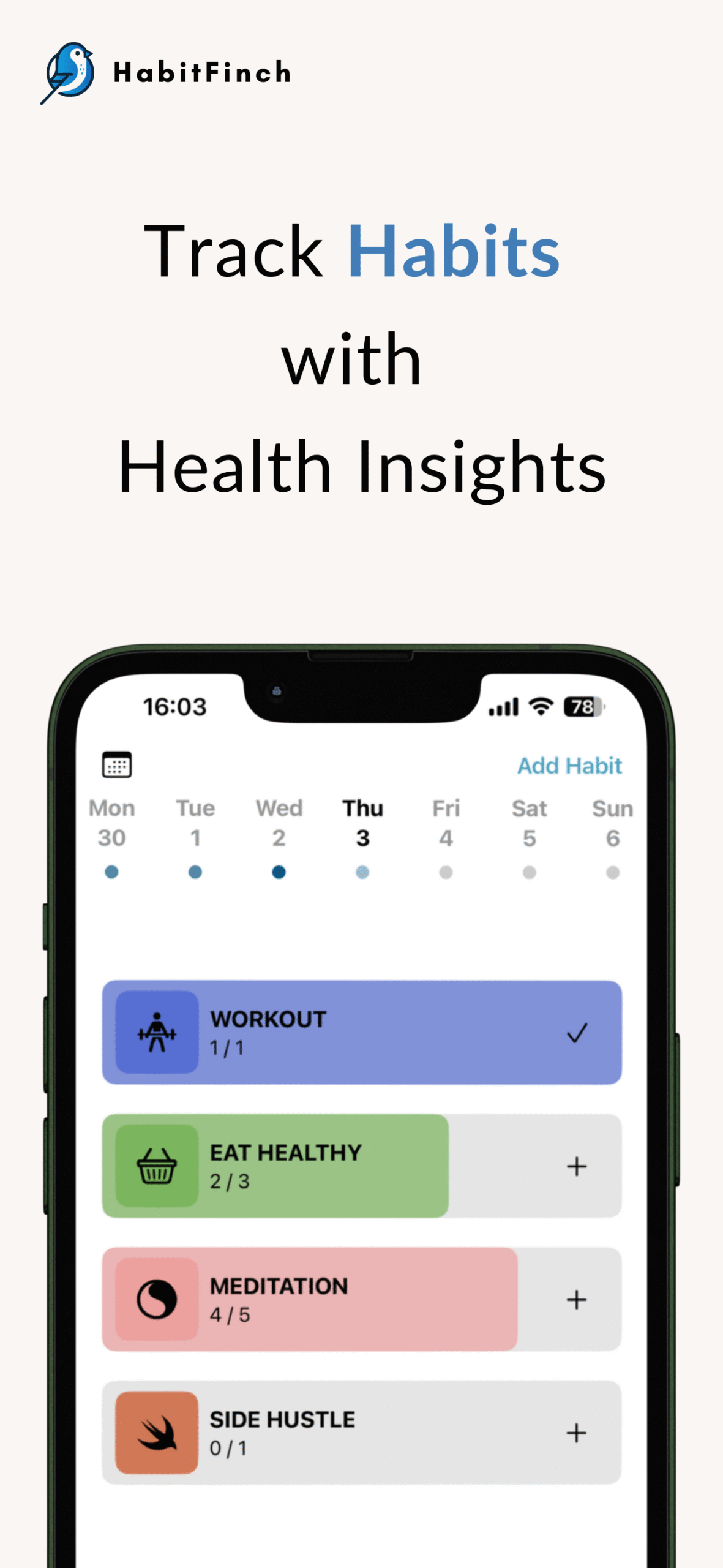 HabitFinch helps you track your habits and understand the factors that truly influence your success. By combining habit tracking with personalized health insights, HabitFinch empowers you to stay consistent and make smarter decisions every day.